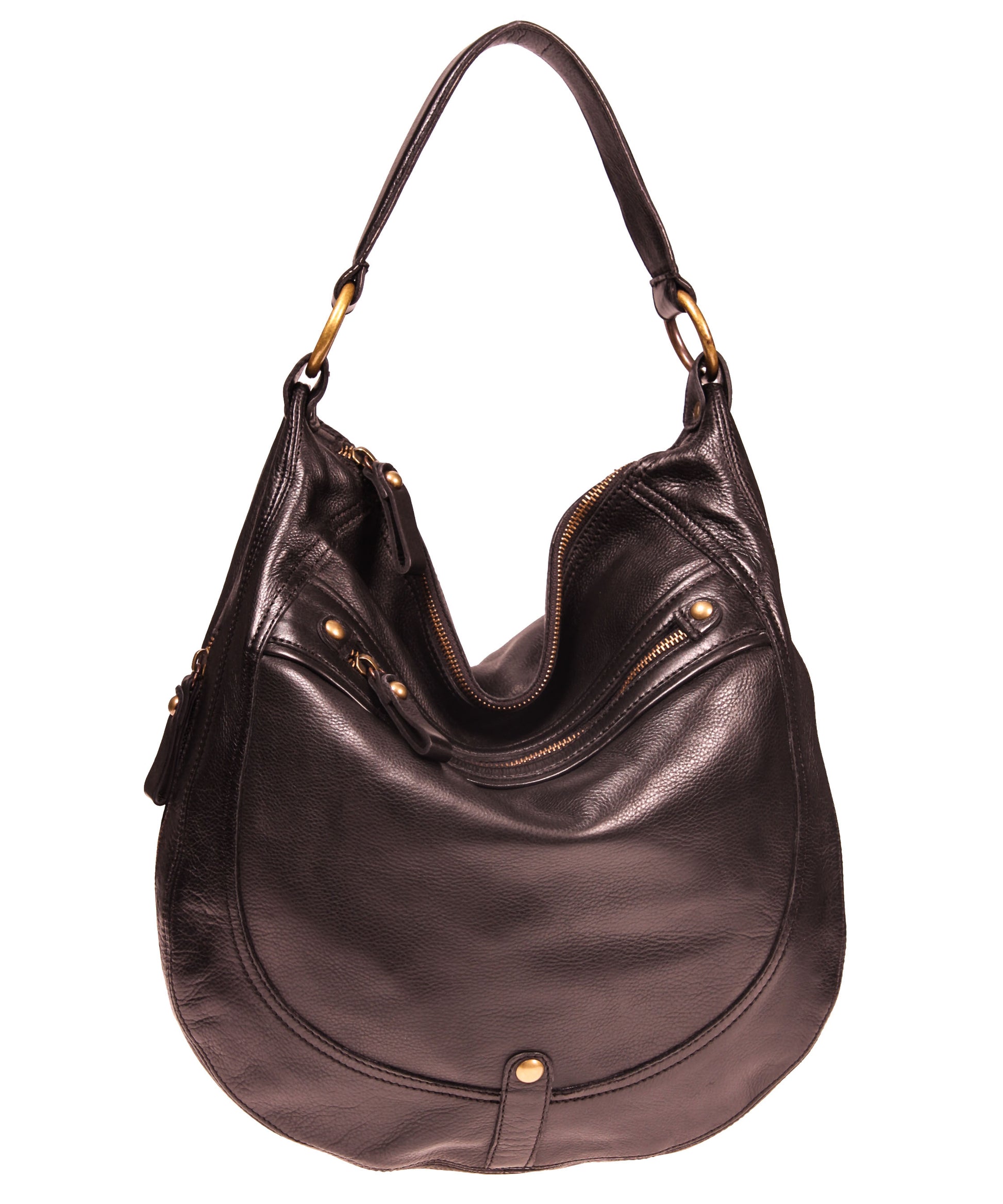 Tano Rounded Hobo with EZ Front Zip pocket in buttery soft vintage leather. EZ access zip cell phone pocket. Leather zip pulls with stud. Wear both ways (pocket facing out or against body for minimal look) Top zip and lined, 1-pocket interior. Brass hardware.