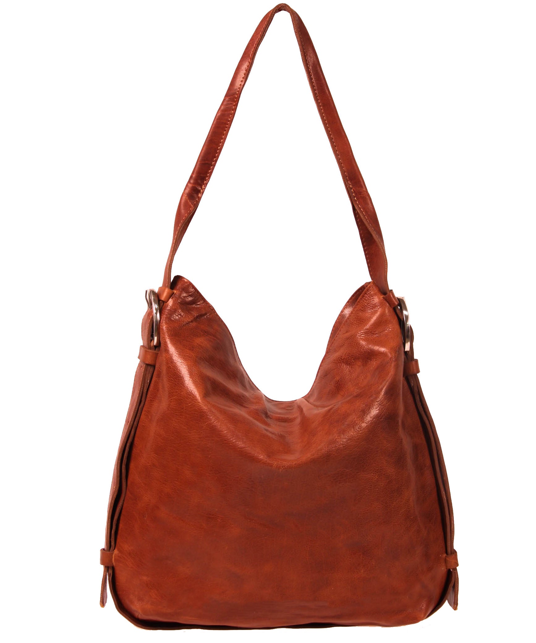 Tano Slouchy Rounded Hobo in rich Italian vegetable tanned pull-up leather. Top zip closure with optional-use hidden magnetic closure. Full around equestrian belting with round vintage buckles. Fully lined. Interior zip pocket. Double interior cell phone pockets (drop that shiny new iPhone 12 in there). Adjustable shoulder strap. Wear over the shoulder.
