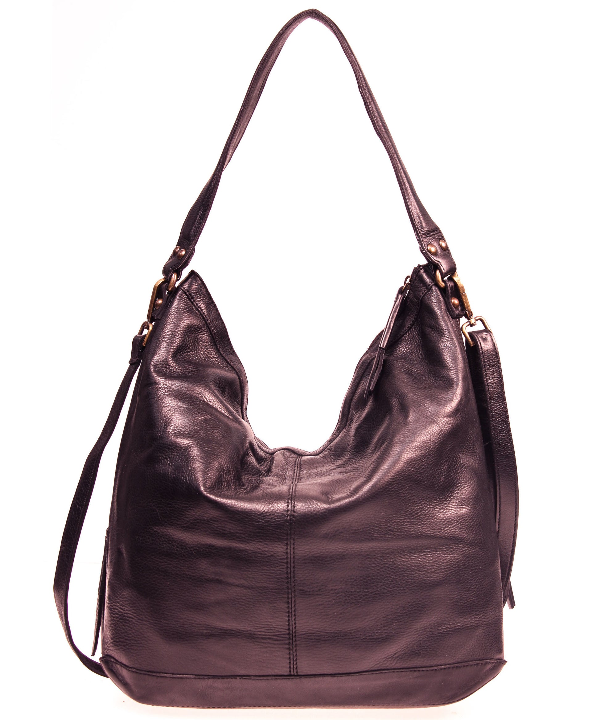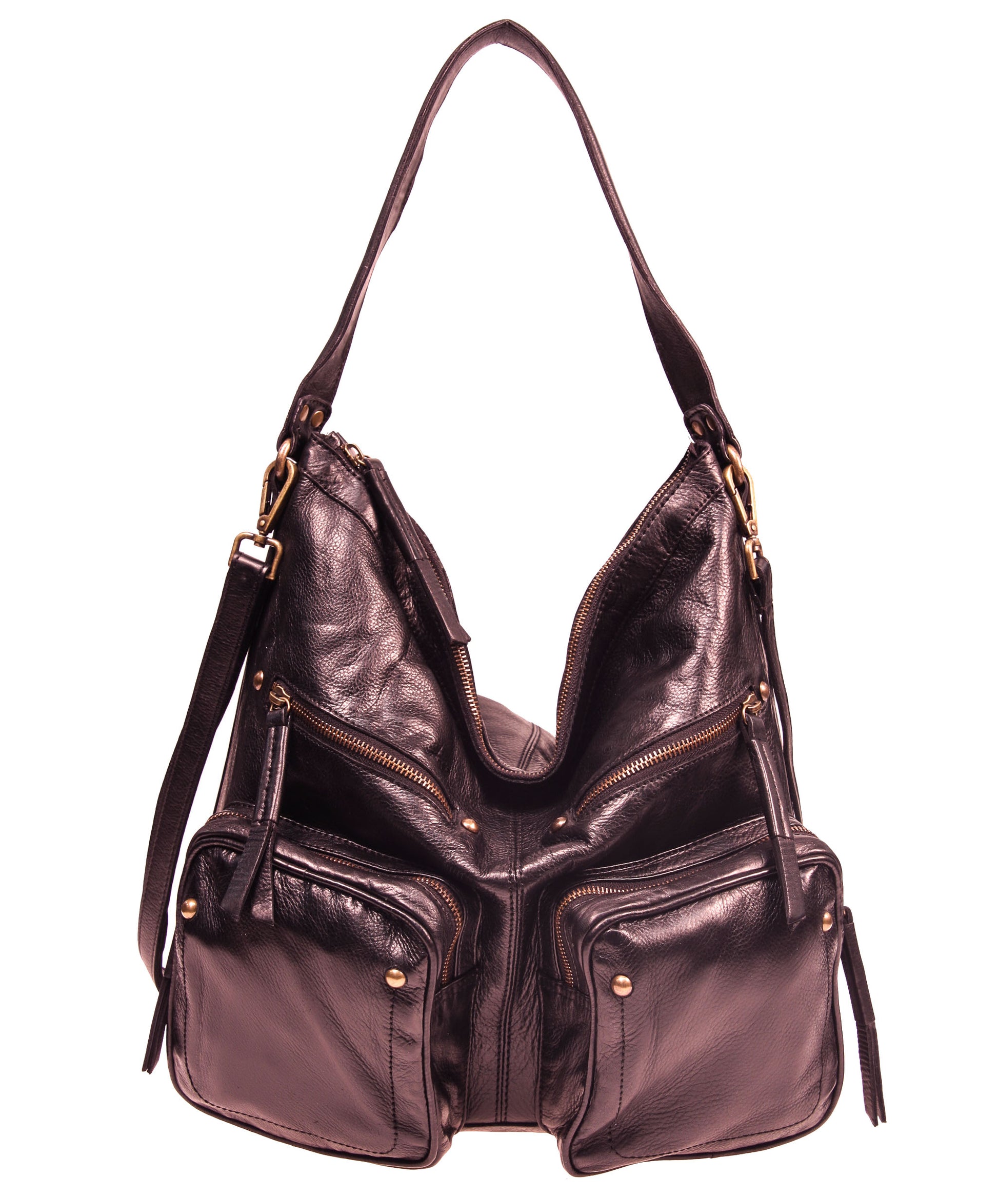 Tano Convertible Cargo Pocket City Hobo in buttery soft aniline leather. Comfortable wide shoulder strap with removable/adjustable long strap. Wear x-body or over the shoulder. Two convenient oversized front cargo zip pockets plus two additional inline zip pockets. Top zip closure. Single leather framed interior zip pocket plus two interior leather cuffed slip pockets - perfect for your phone. Brass hardware fittings.