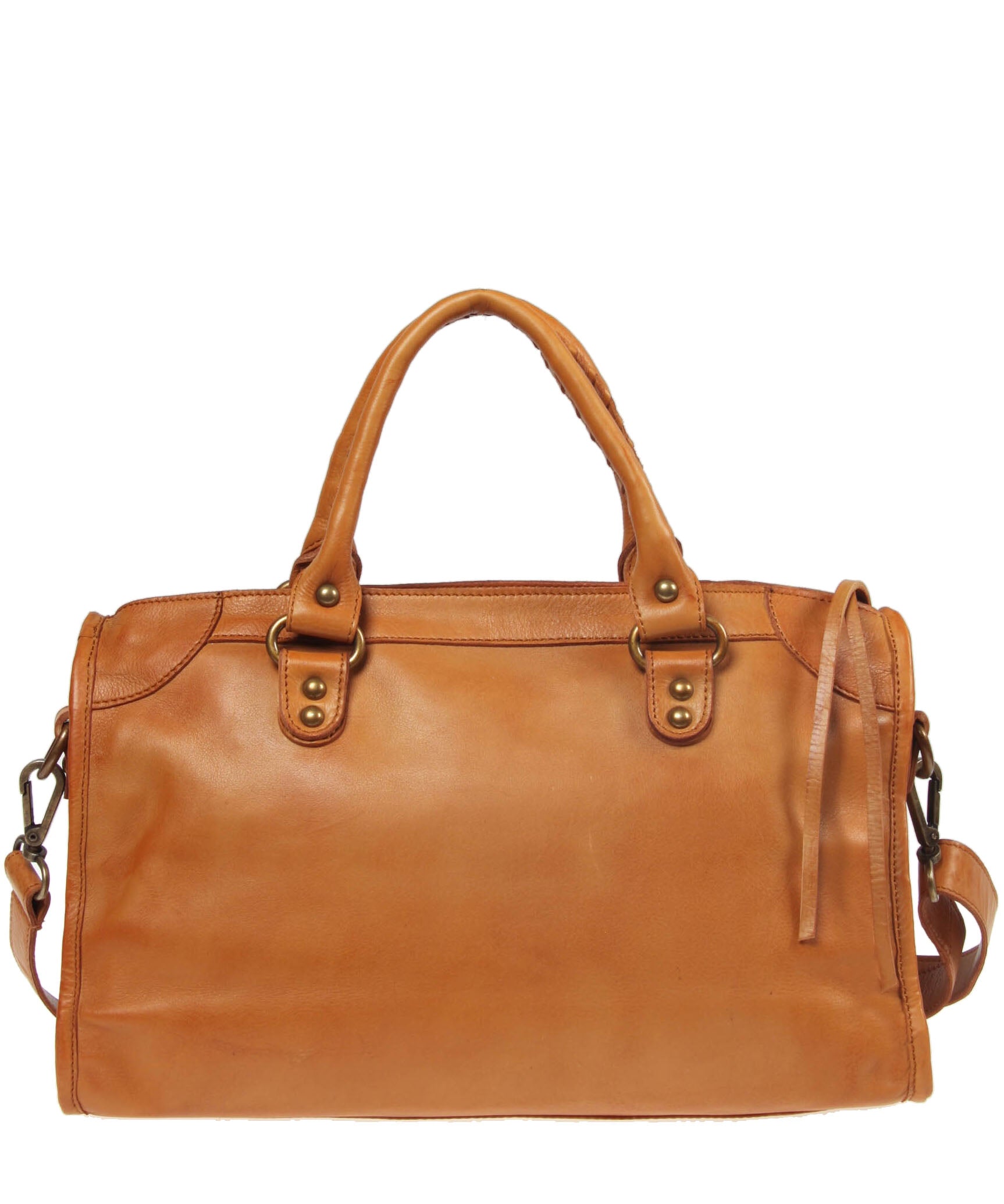 Tano Equestrian Satchel w Whipstitch Handle in "melt in your hand" soft vintage leather. Large front zip pocket. Top zip and lined, 3-pocket interior. Detachable long shoulder strap with antique brass hardware. Wear over the arm, in hand, or across the body.